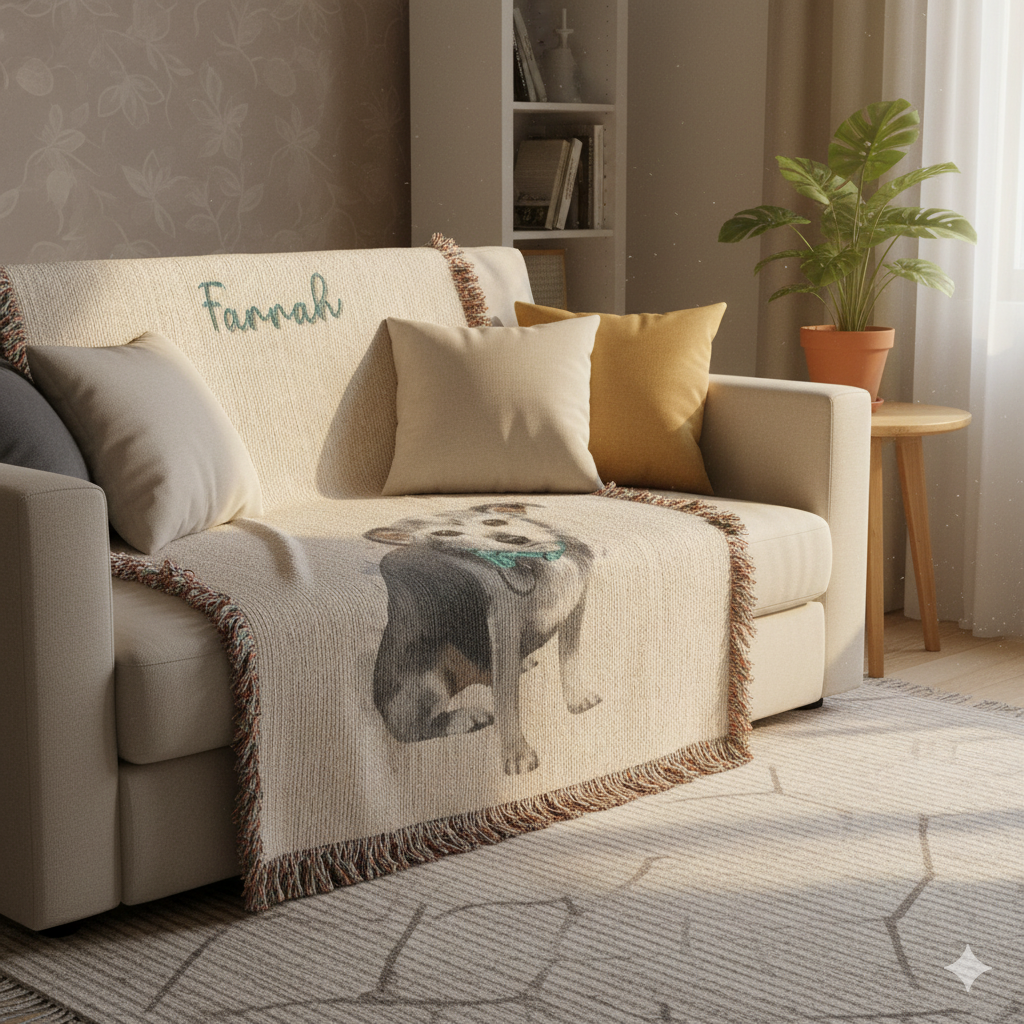 Celebrate your beloved pet with custom woven blankets. Personalize with photos, names, and paw accents for a heartfelt gift that lasts a lifetime.