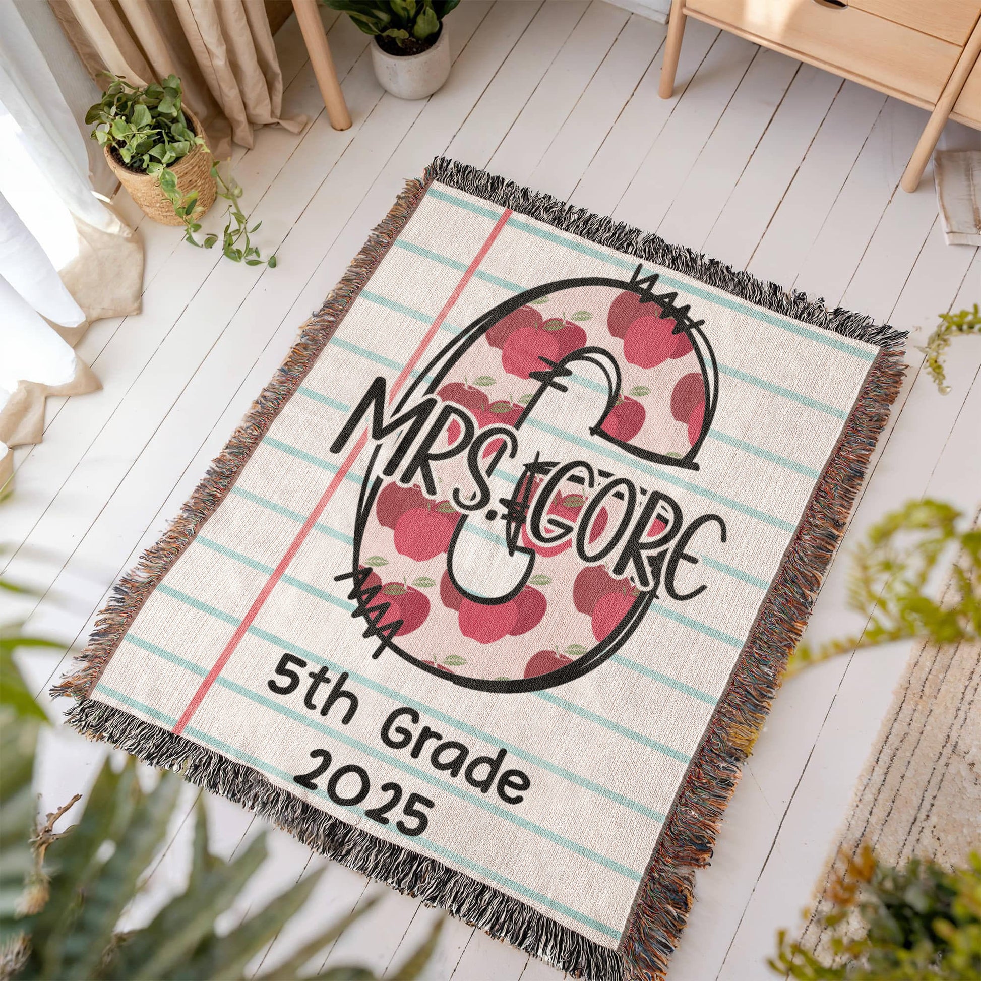 This Custom Teacher Initial Woven Blanket features the teacher’s name, grade, and year on a watercolor-inspired background — a cozy, personalized keepsake for any teacher.