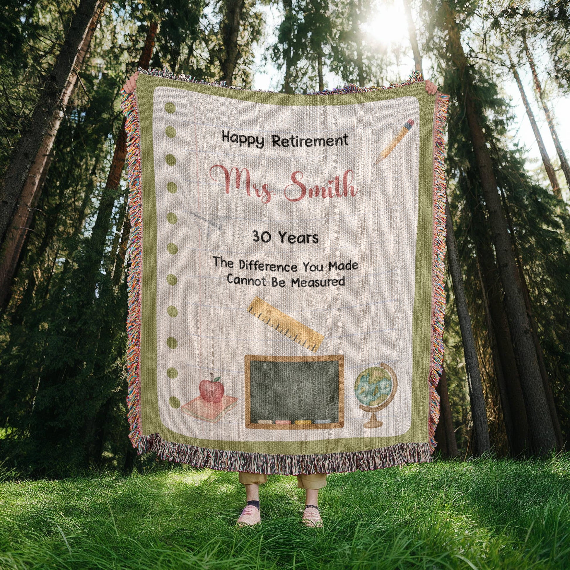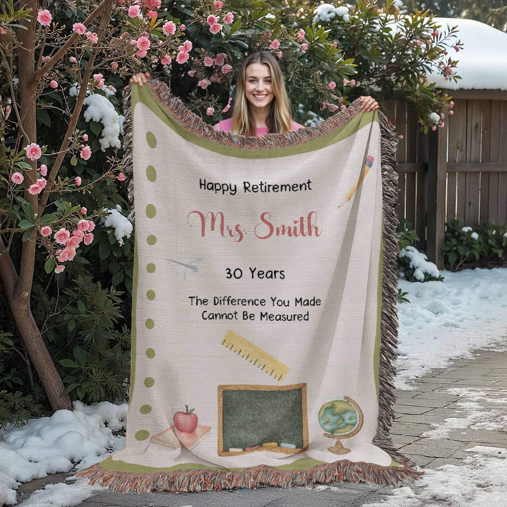 This Custom Teacher Retirement Woven Blanket features the teacher’s name and years of service in a soft watercolor-inspired design — a cozy, heirloom-quality keepsake for retirement.